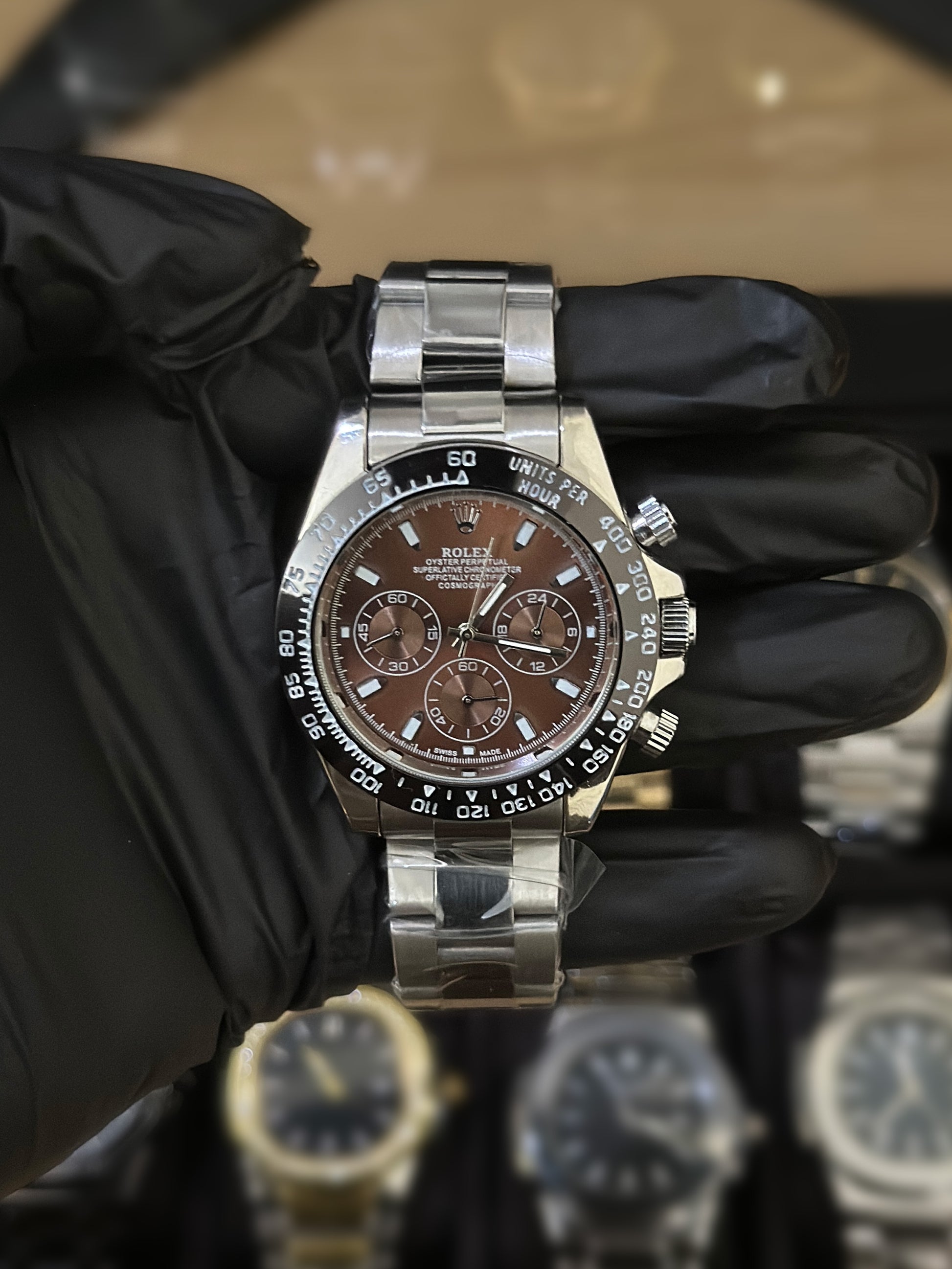 Embrace the spirit of speed and luxury with the Rolex Cosmograph Daytona – Silver with Brown Dial, a timepiece engineered for precision and prestige. Featuring a sleek silver stainless steel case and a rich brown dial, this watch captures the essence of motorsport-inspired elegance. The iconic chronograph layout and tachymeter bezel make it a favorite among racing enthusiasts and collectors alike.