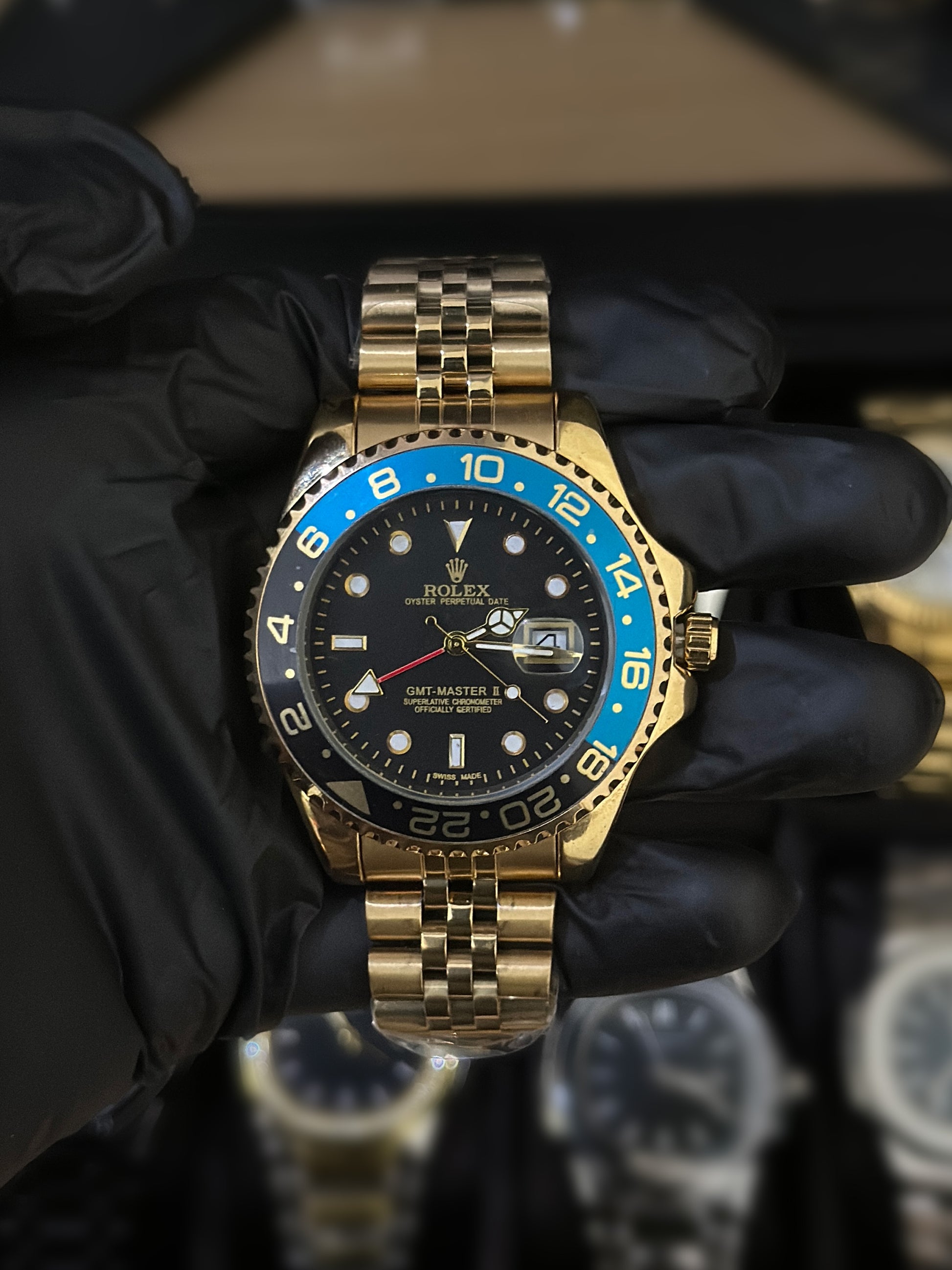 Command attention across time zones with the Rolex GMT – Golden Case with Black & Blue Dial, a masterclass in bold luxury and global sophistication. The striking gold-tone case pairs flawlessly with the dual-tone black and blue dial, evoking both elegance and adventure. Designed for world travelers and style connoisseurs, the GMT function allows seamless tracking of multiple time zones—perfect for jet-setters and business elites.