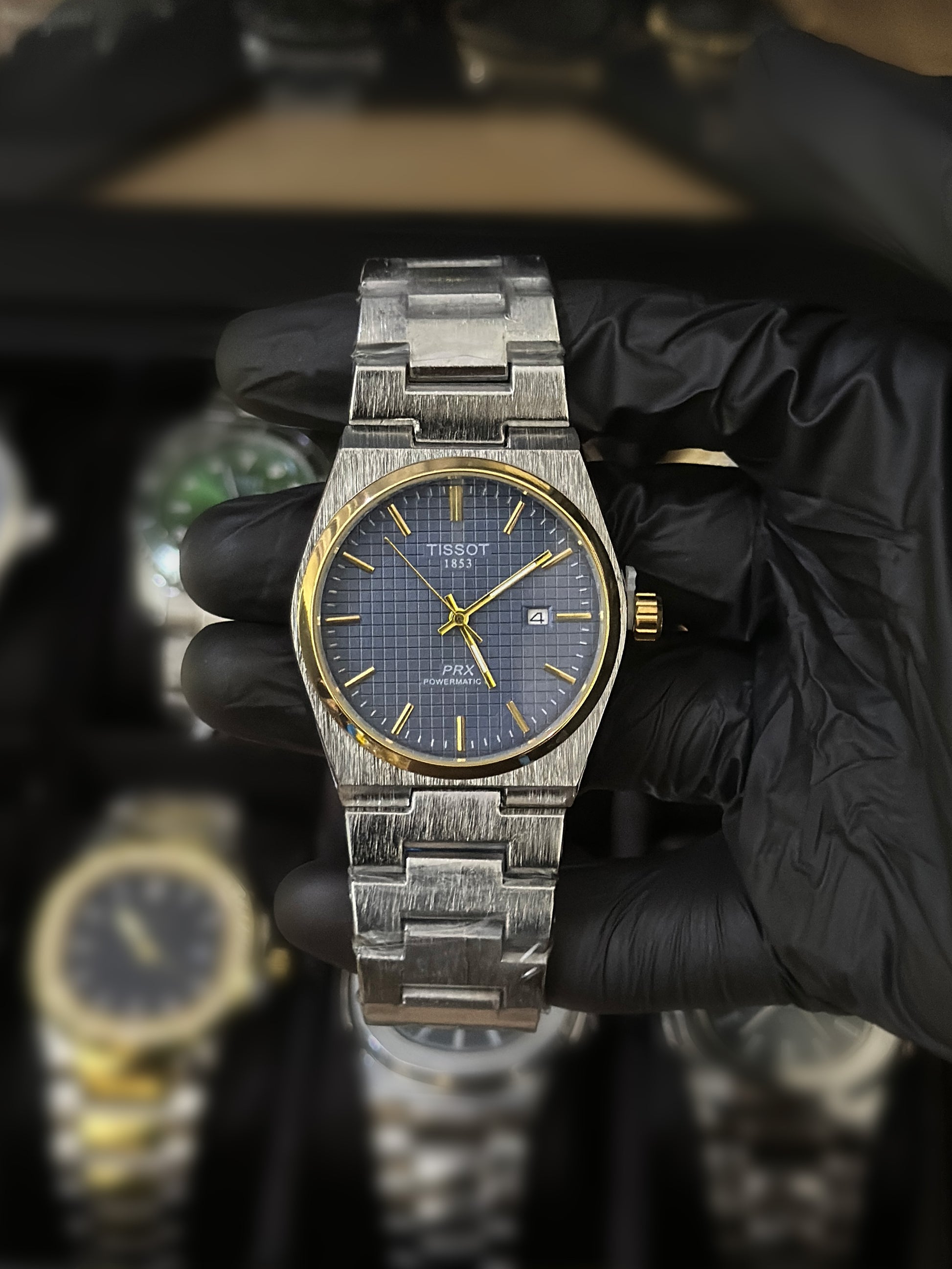 Make a bold impression with the Tissot PRX – Silver Case with Golden/Blue Dial, a watch that blends vintage inspiration with contemporary flair. The silver stainless steel case houses a vibrant gold-accented blue dial, offering a rich contrast that’s both eye-catching and refined. With its slim silhouette and integrated bracelet, this PRX model is a nod to classic 1970s design—reimagined for today’s trendsetters.